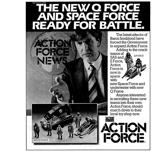 Lastly, the 1983 Action Force toys had a staggered release. The Q Force and Space Force teams were added to the Action Force roster in time for the Christmas market. As a result, the early Battle Action Force stories are outweighed by the SAS and Z Force. |